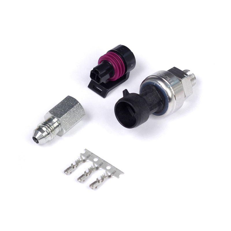 This kit comes with everything needed for a professional install, including the 150 PSI sensor, a matching Delphi 3-pin plug with pins, and a -4 AN adapter fitting for easy integration into custom plumbing or remote-mount lines.