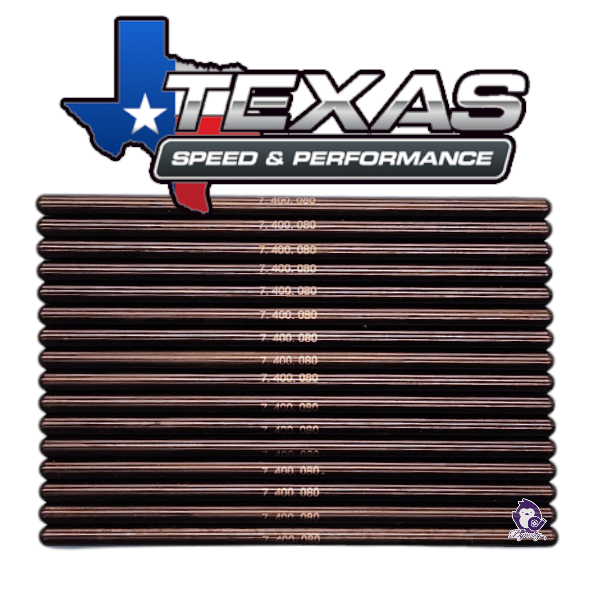 Genuine TSP Texas Speed & Performance Chromoly Pushrods, set of 16 7.400" Length 5/16" Diameter Hardened pushrods are a must for any valvetrain upgrade on your LS based engine. These TSP chromoly pushrods feature .080" wall thickness & are designed for stability under high rpm use. These one-piece pushrods are heat-treated and feature oil holes that are drilled and chamfered to prevent stress fractures and cracks. Fits: 4.8, 5.3, 6.0, 6.2L blocks LS1 LS2 LS3 LS4 LS6 LSA LQ4 LQ9 LM7 LC9 99-13 Trucks 98-13 Vettes 98-02 Camaro / Trans Am 04-06 CTS-V 09-13 CTS-V If you are building a custom valvetrain setup please measure for push rods before ordering. A large number of variables are involved in determining the correct length pushrod for your application. Pushrod length is affected by any of the following: Block deck height Head deck height Head stud boss height Rocker arm brand/design Cam base circle size Lifter design/brand/pushrod seat height Valve stem length Don't assume anything when determining the right pushrod for your new engine. A pushrod that fits one engine may not necessarily work in another. Any number of items can be different on your engine, requiring you to use a different pushrod length.