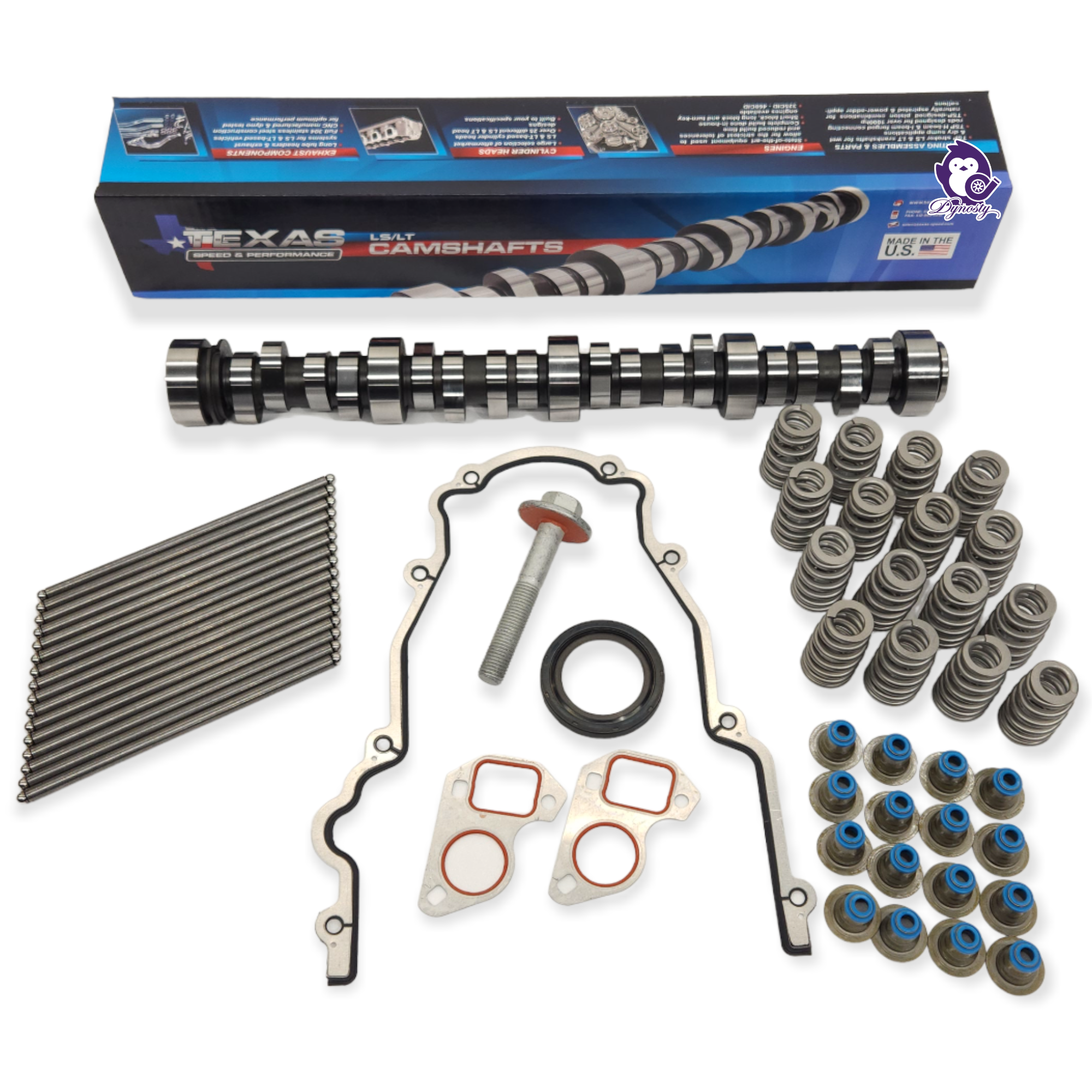TSP Stage 2 Low Lift Truck Cam Specs: 212/218, .550/.550 112 LSA Package Includes: TSP Stage 2 Low Lift Truck Camshaft .560" Lift Beehive Valve Springs Valve Seal Set Stock Replacement 7.400" Pushrod Set OEM GM Replacement Balancer Bolt (for wet sump engines) Front Cover Gasket Front Cover Seal Water Pump Gaskets This cam gained 51.4 HP and 22.9 TQ at the flywheel on a SuperFlow 902 engine dyno using an otherwise stock 5.3L engine! This cam uses proprietary TSP lobe profiles that are designed to utilize the factory GM LS6 single beehive valve springs and your factory pushrods, making them the most affordable cam package on the market! 1200-5800 RPM Power Band; This is an excellent performance camshaft with a smooth idle! We've had tons of customers select this camshaft when looking for a cam that drives almost stock and can be practically hidden with some exhaust systems! If you're looking for a small, stealth camshaft the 212/218 is a great option to consider. It is ideal for 4.8L, 5.3L, and 5.7L vehicles and works with a factory torque converter. Engines best suited for: 4.8, 5.3, 5.7, 6.0 Desired Compression ratio for cam: 9.5:1+ Recommended Springs Required: GM LS6 Single Beehive Springs Aftermarket Stall Converter Required: No, not needed Upgraded Rear Gear Required: No, not needed Operating RPM Range: 1200-5800 Power Increase: Gains of 51 Horsepower and 23 Ft. Pounds of Torque! Drivability: Will drive just like stock after proper tuning!